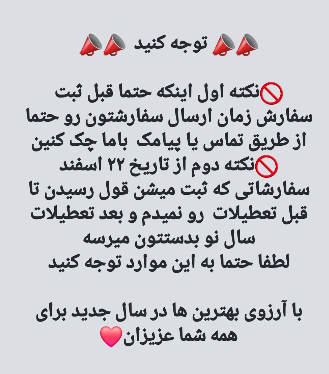 برای عملکرد بهتر و سریع تر از فیلتر شکن استفاده نکنید💥 📌❌️حتما حتما به زمان ارسال سفارش دقت کنید 🚫 فقط کارهای ارسال فوری تا قبل تعطیلات سال نو میرسه به دستتون ❌️ برای دریافت کد پیگیری ۳ روز بعد از زمان ارسال اقدام کنید با تشکر🙏