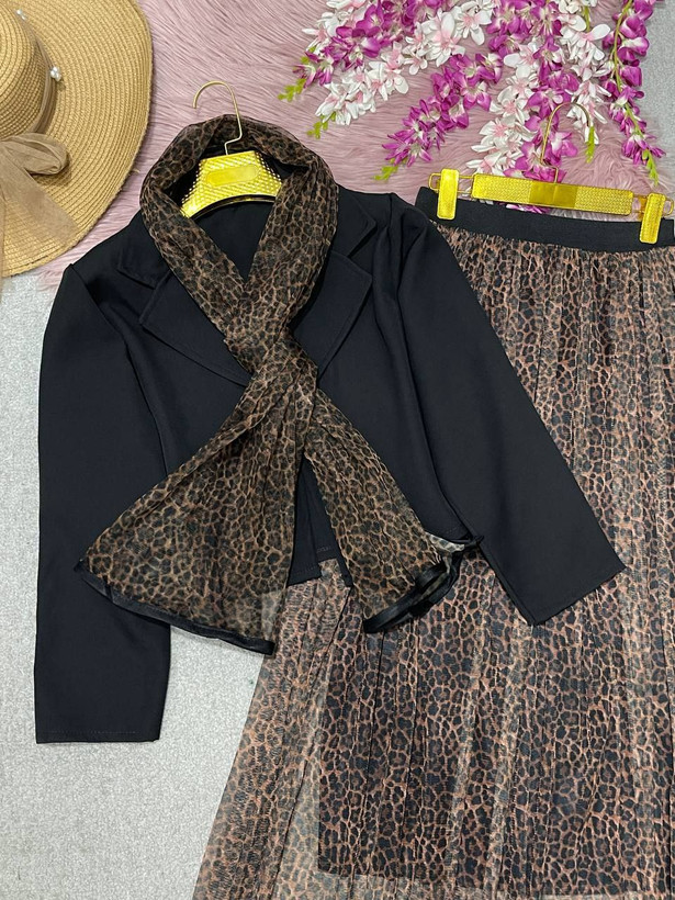 توضیحاتنام : ست سه تیکه رونیا🍀 ✅️کت+دامن+شال 🪡جنس : کت کرپ مازراتی دامن و شال تور 🌈رنگ بندی : پلنگی✔️ ⚜️سایز ها : فری۳۸تا۴۶✔️