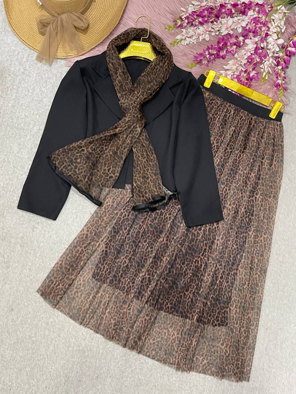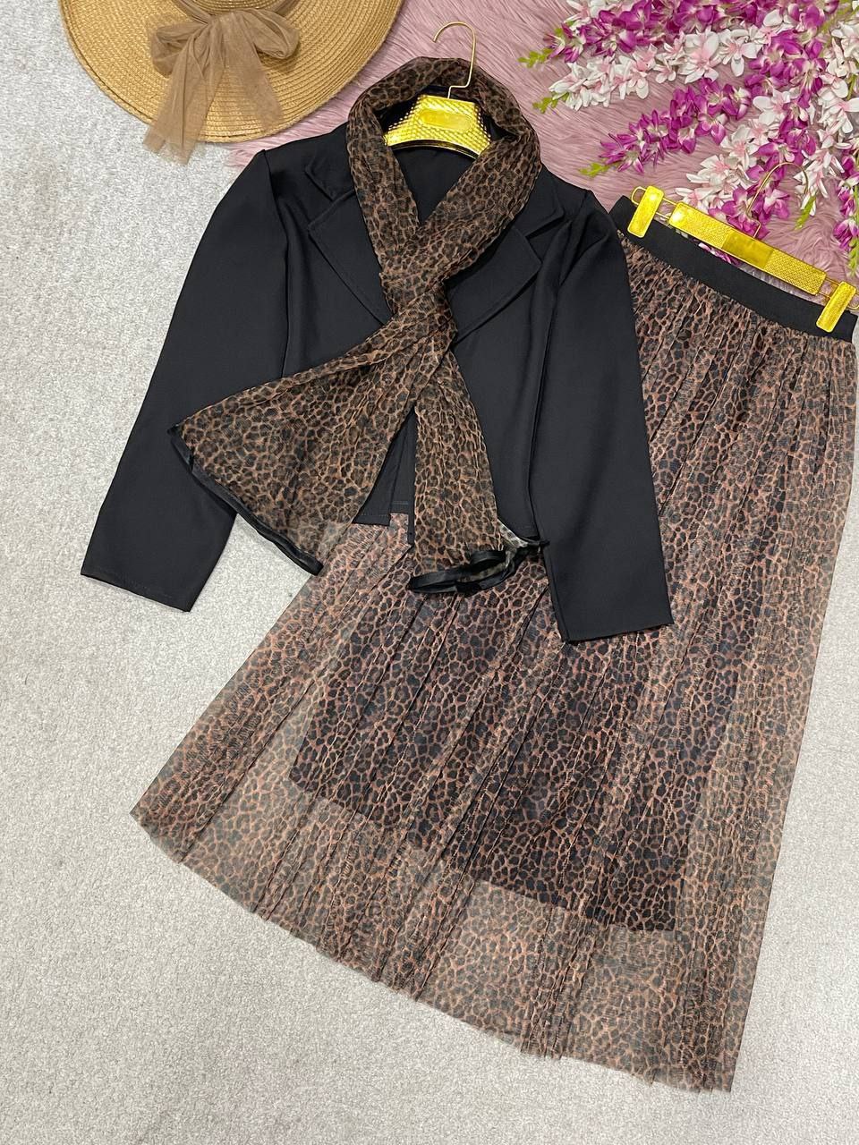 توضیحاتنام : ست سه تیکه رونیا🍀 ✅️کت+دامن+شال 🪡جنس : کت کرپ مازراتی دامن و شال تور 🌈رنگ بندی : پلنگی✔️ ⚜️سایز ها : فری۳۸تا۴۶✔️