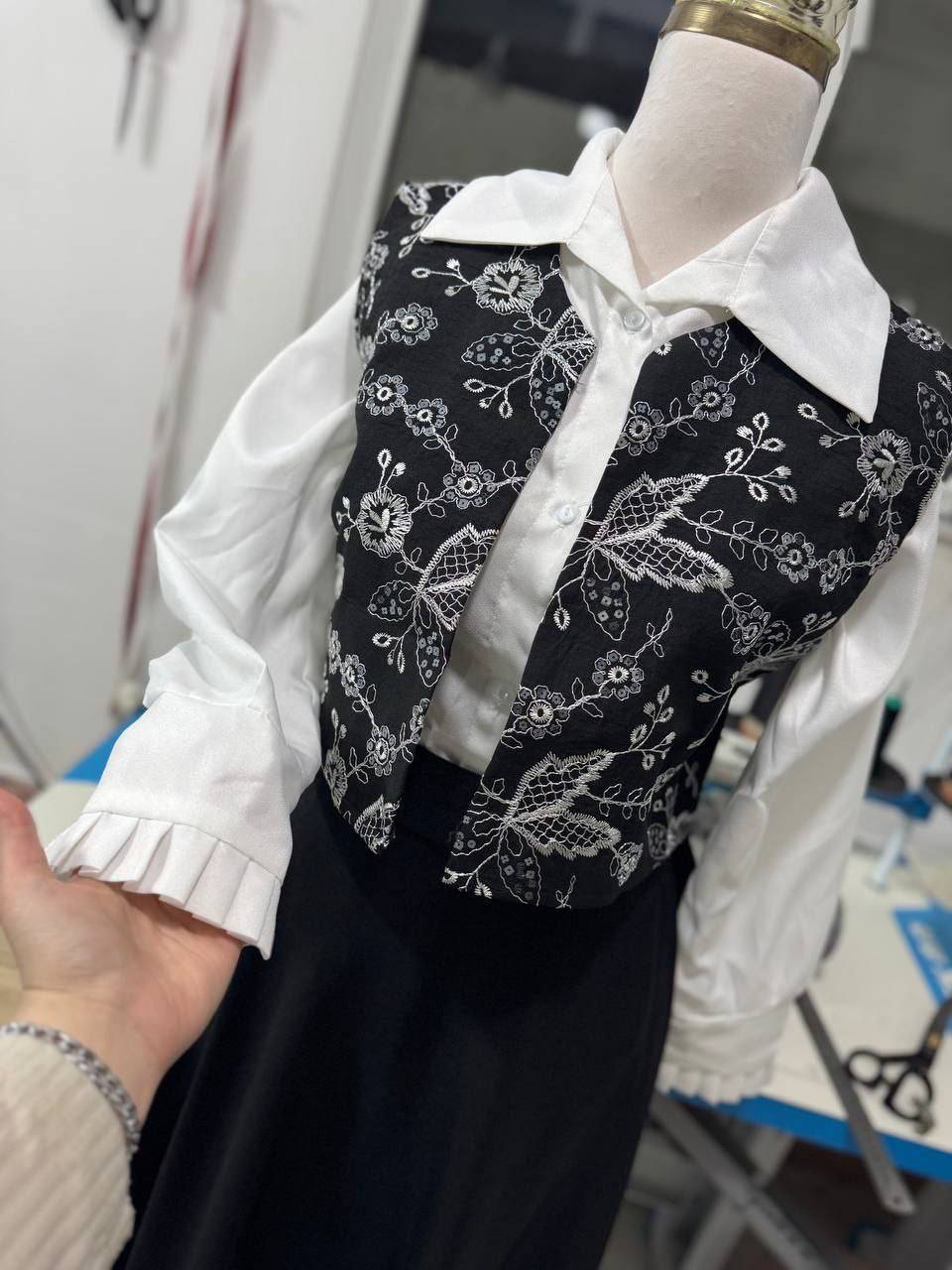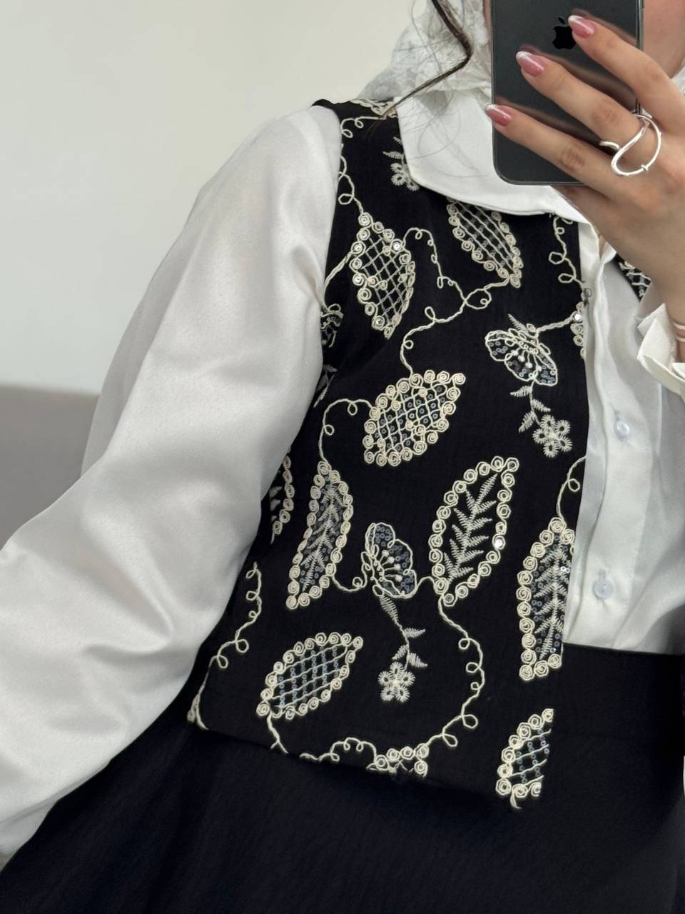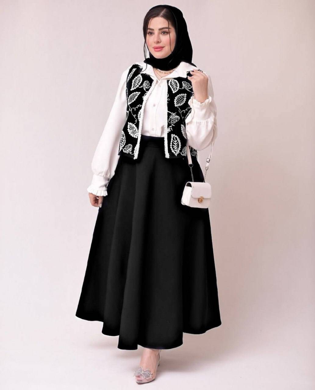 ست سه تیکه شومیز و دامن و جلیقه کرپ لنین سوزندوزی مدل ثریا 2