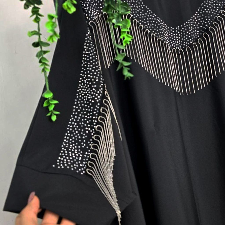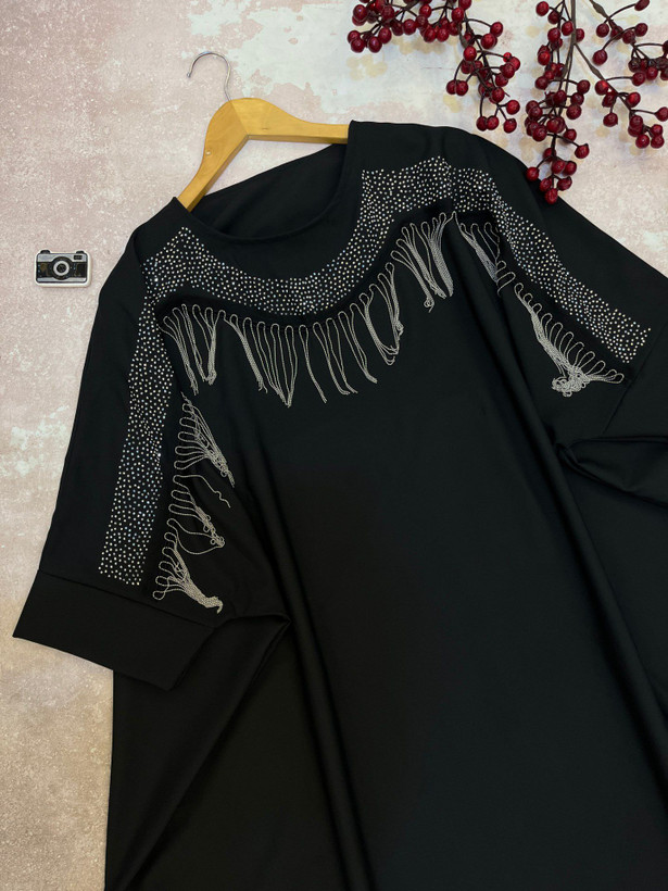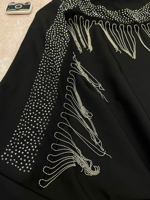 🗒️توضیحات :از داخل بندتنظیم سایز داره، نگینها پرسی بدون ریزش، پارچه کاملا مشکی، پایین کار هلالیه.خرجکار زنجیریش دوخت شده و جدا نمیشه، پشت کار ساده ست