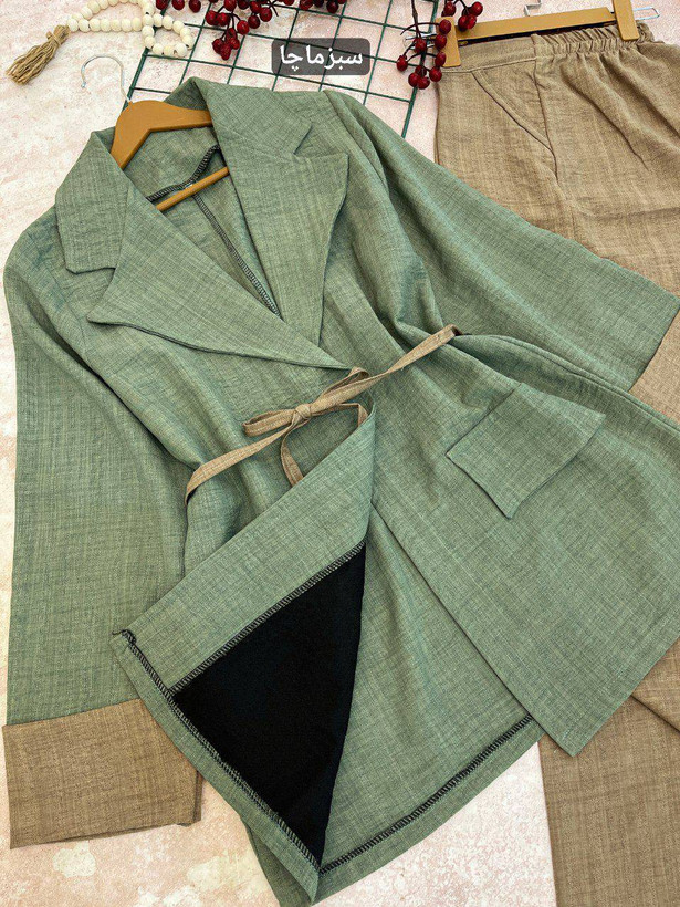 🗒️توضیحات :تمام جلوی کت و داخل یقه رولایی پرشین زدیم که خوش ایست باشه، پارچه اصلا آبرفت و رنگدهی نداره، چروک نمیشه، پرز نمیده، دوخت برش مزونی ودرجه یک، پشت کمر شلوار کش خورده و جلوی شلوارزیپ ودکمه خورده و پیلی داره، جیبها نما