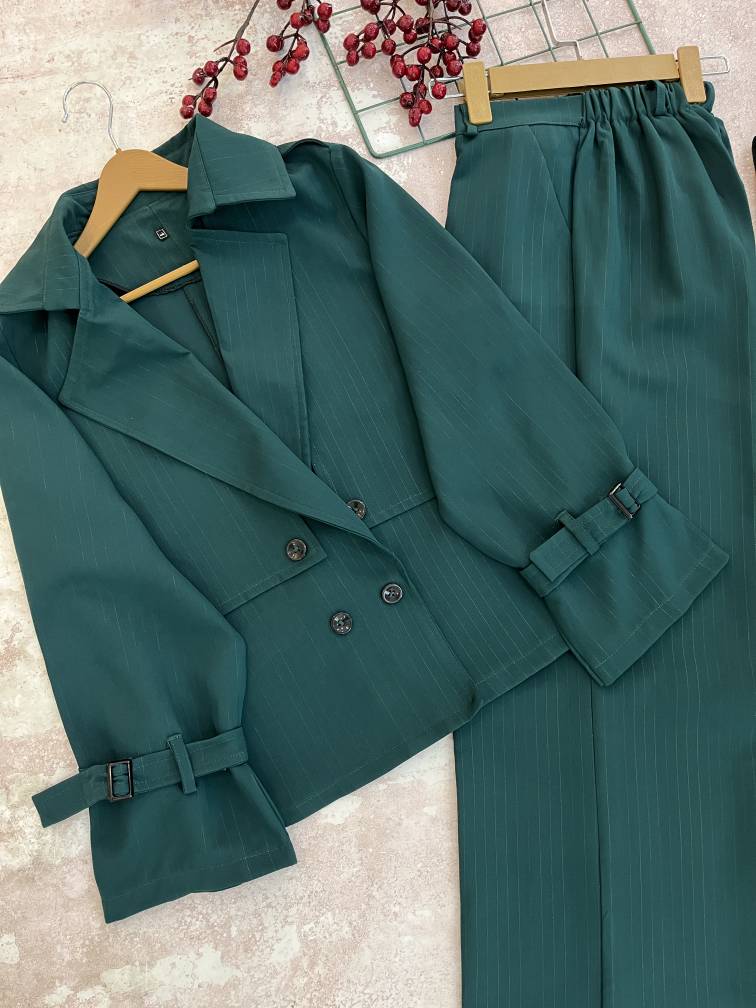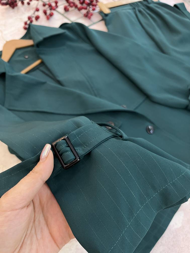 🗒️توضیحات :شلوار زیپ و دکمه و جیب کاربردی داره،کمربند سگک دار داره و پشت کمرش کشه. پارچه مرغوب و درجه یک. کیفیت دوخت مزونی، دکمه ی کت کاربردیه.داخل یقه و سجاف لایی خورده