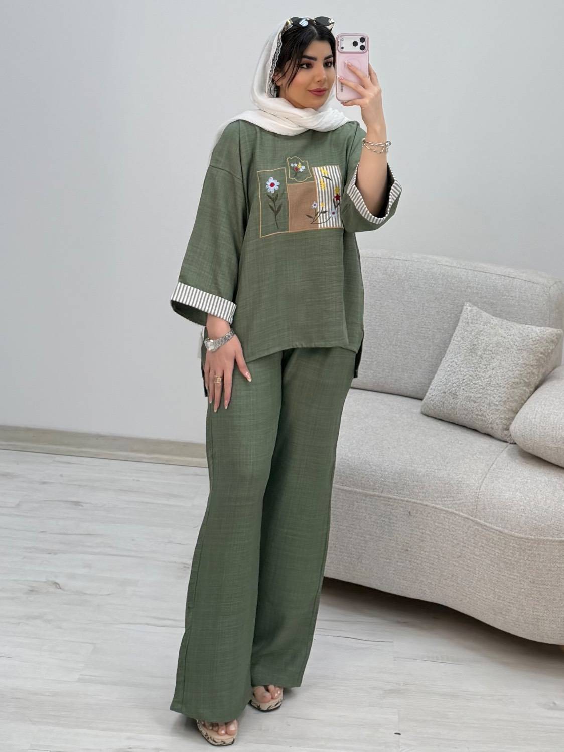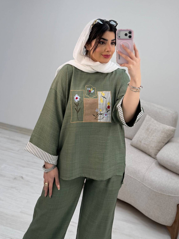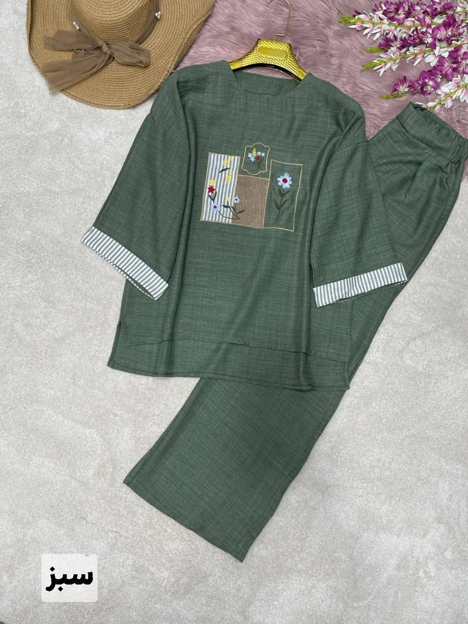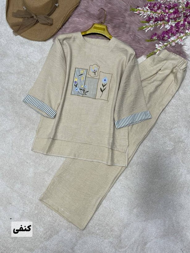 قدجلوشومیز حدودا ۶۵ قداستین از یقه ۵۲ دوربازو ۴۸ دورسینه ۱۲۰ قدشلوار ۱۰۵ دورران ۶۶ دمپا۵۲