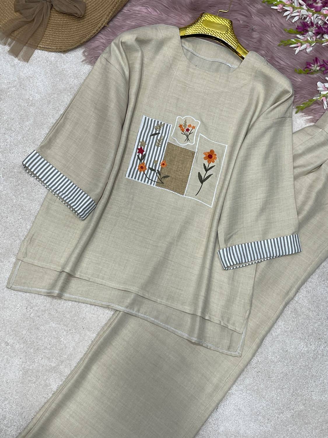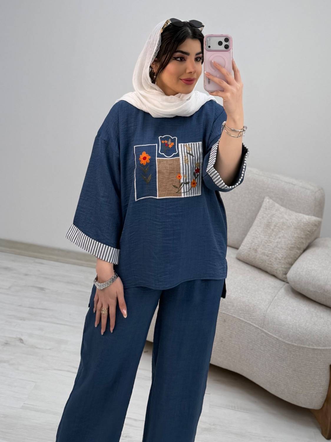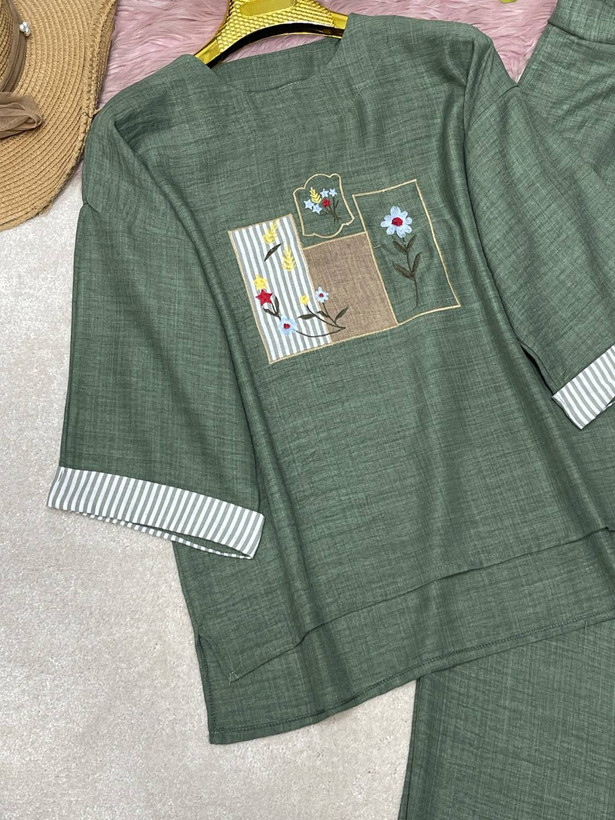 قدجلوشومیز حدودا ۶۵ قداستین از یقه ۵۲ دوربازو ۴۸ دورسینه ۱۲۰ قدشلوار ۱۰۵ دورران ۶۶ دمپا۵۲