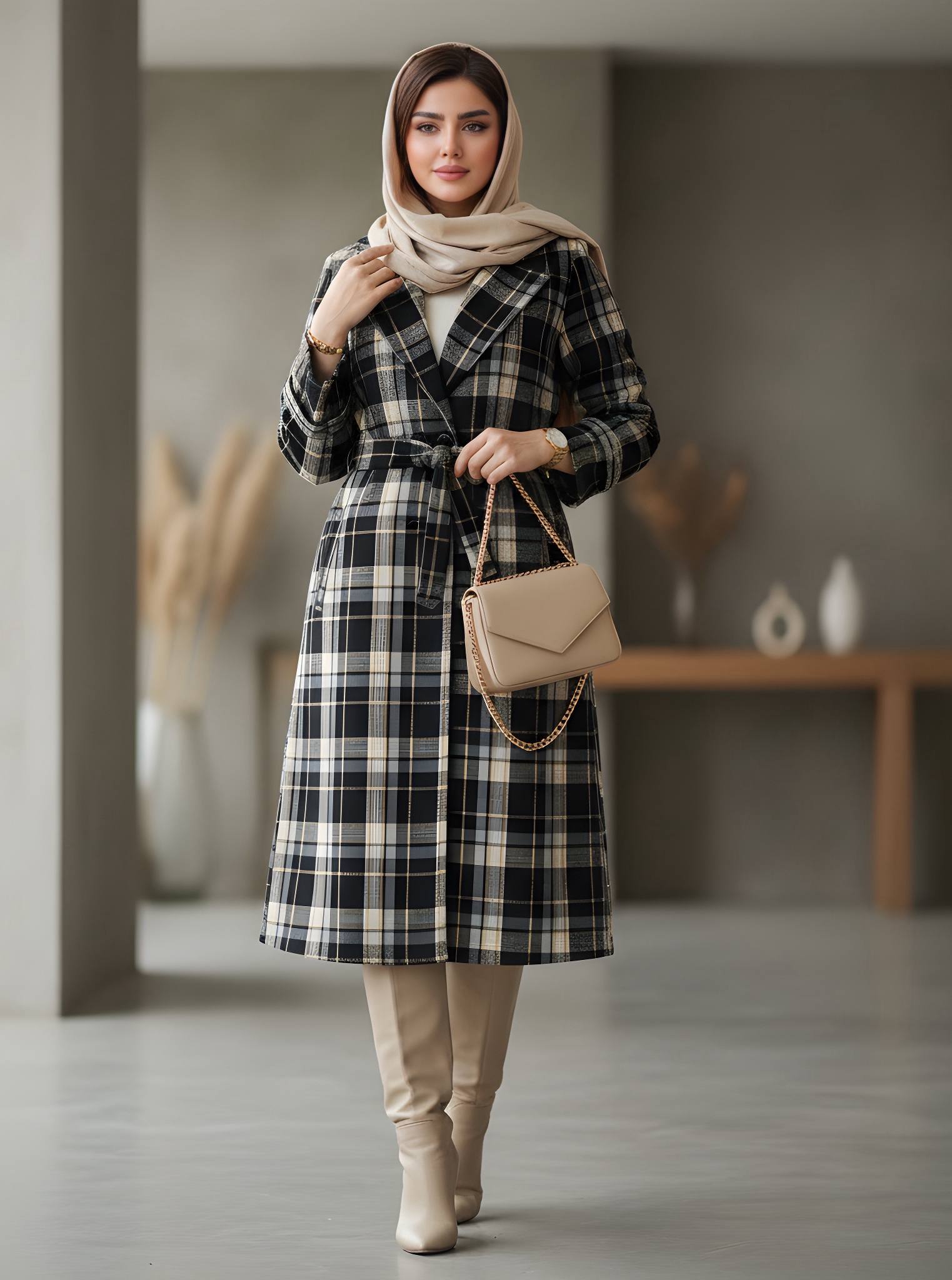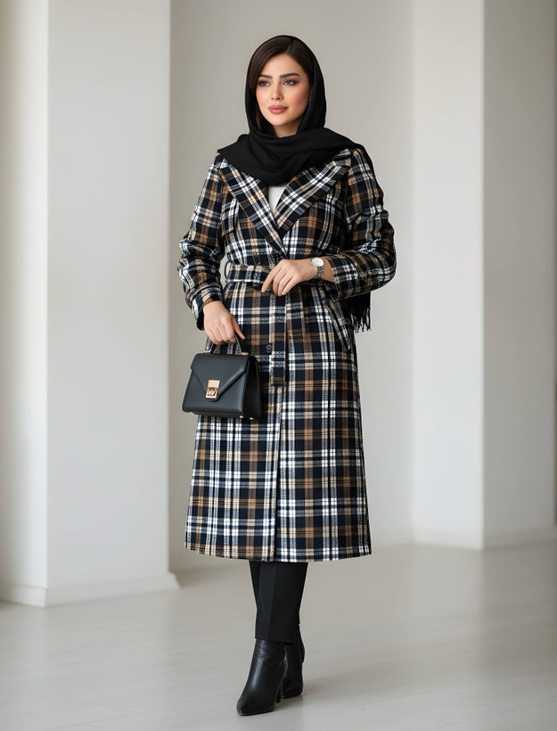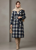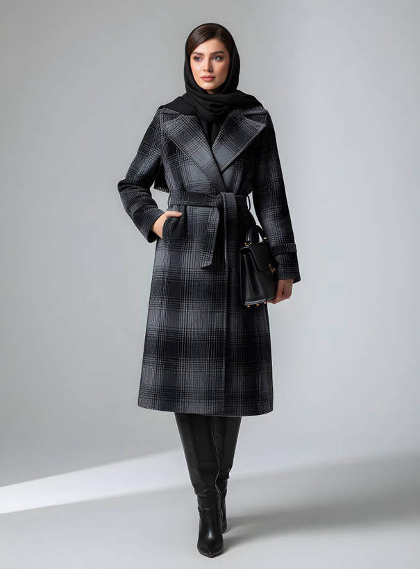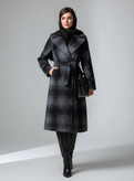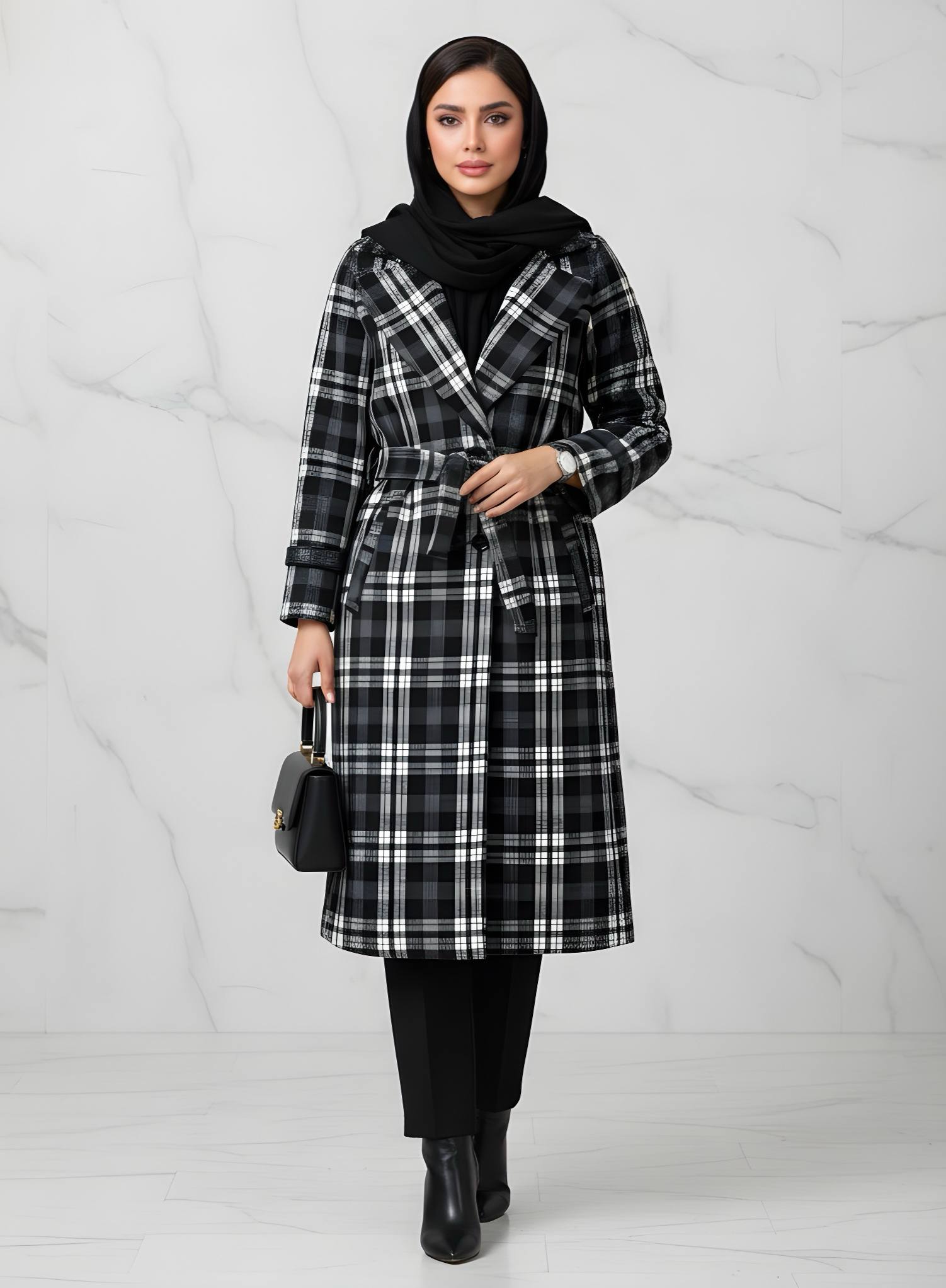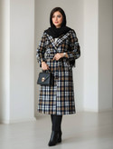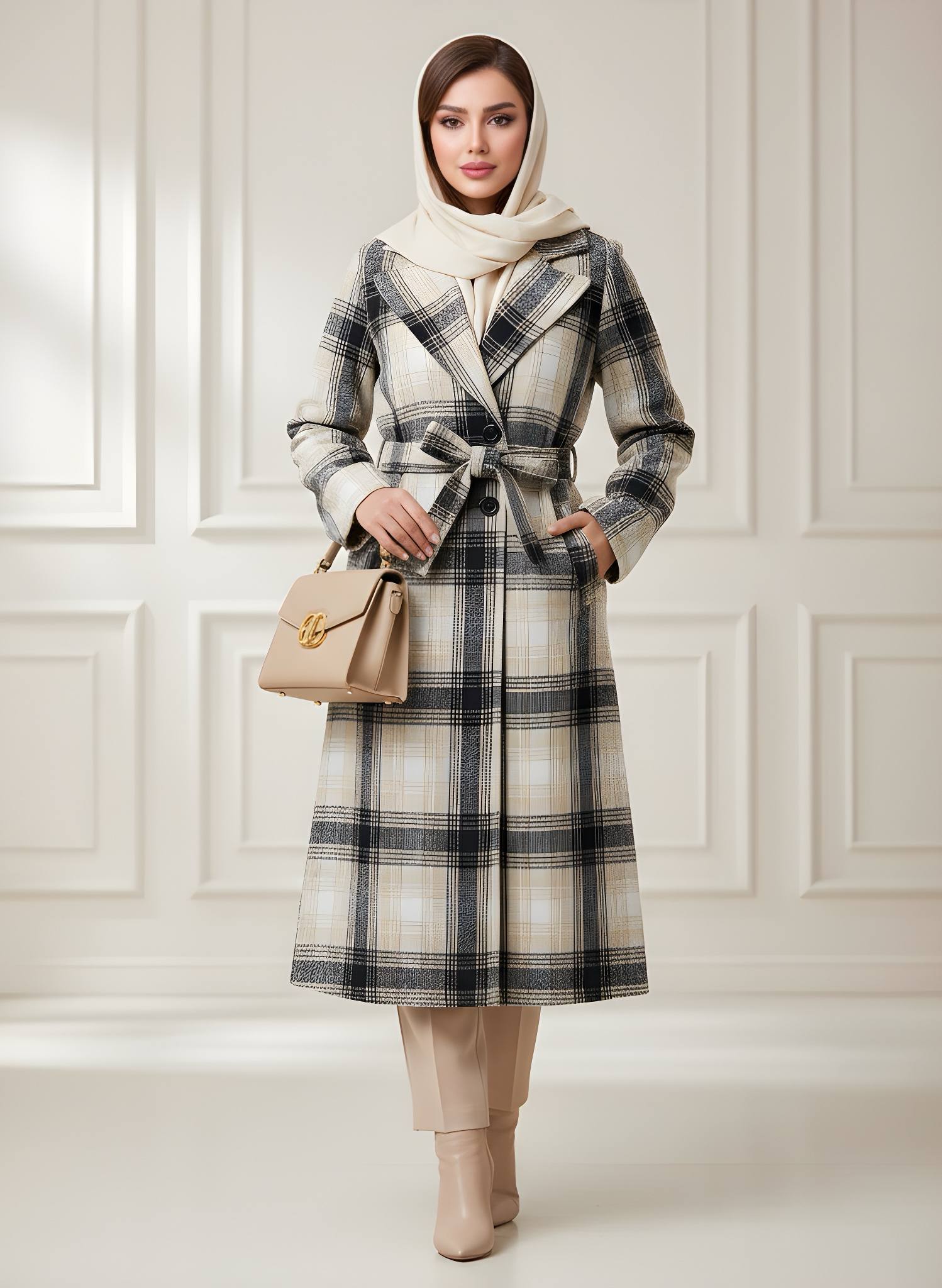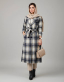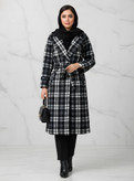 پالتو چهار خونه پشمی موهر دار کمربنددار