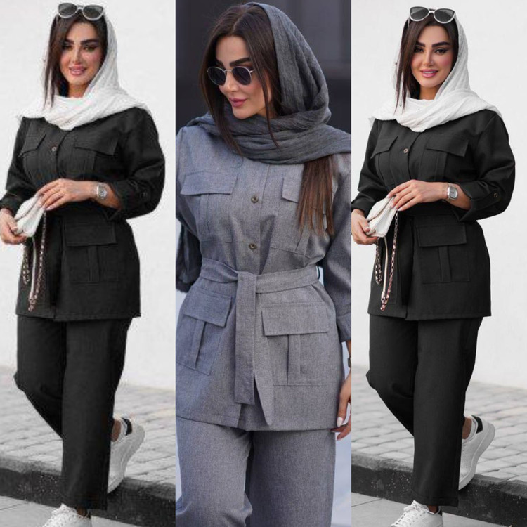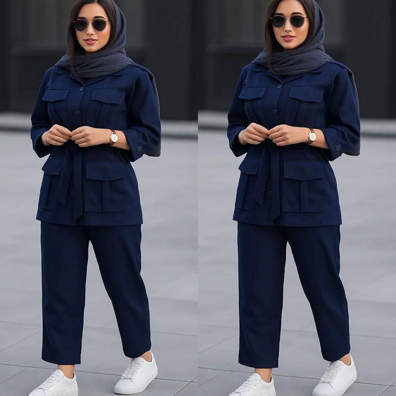 ✅قداستین۵۷✅ دوربازو۴۵ ✅دورسینه110 ✅قدشلوار۹۰ ✅دورران60✅دمپا۴۰ پشت کمر شلوار کش خورده