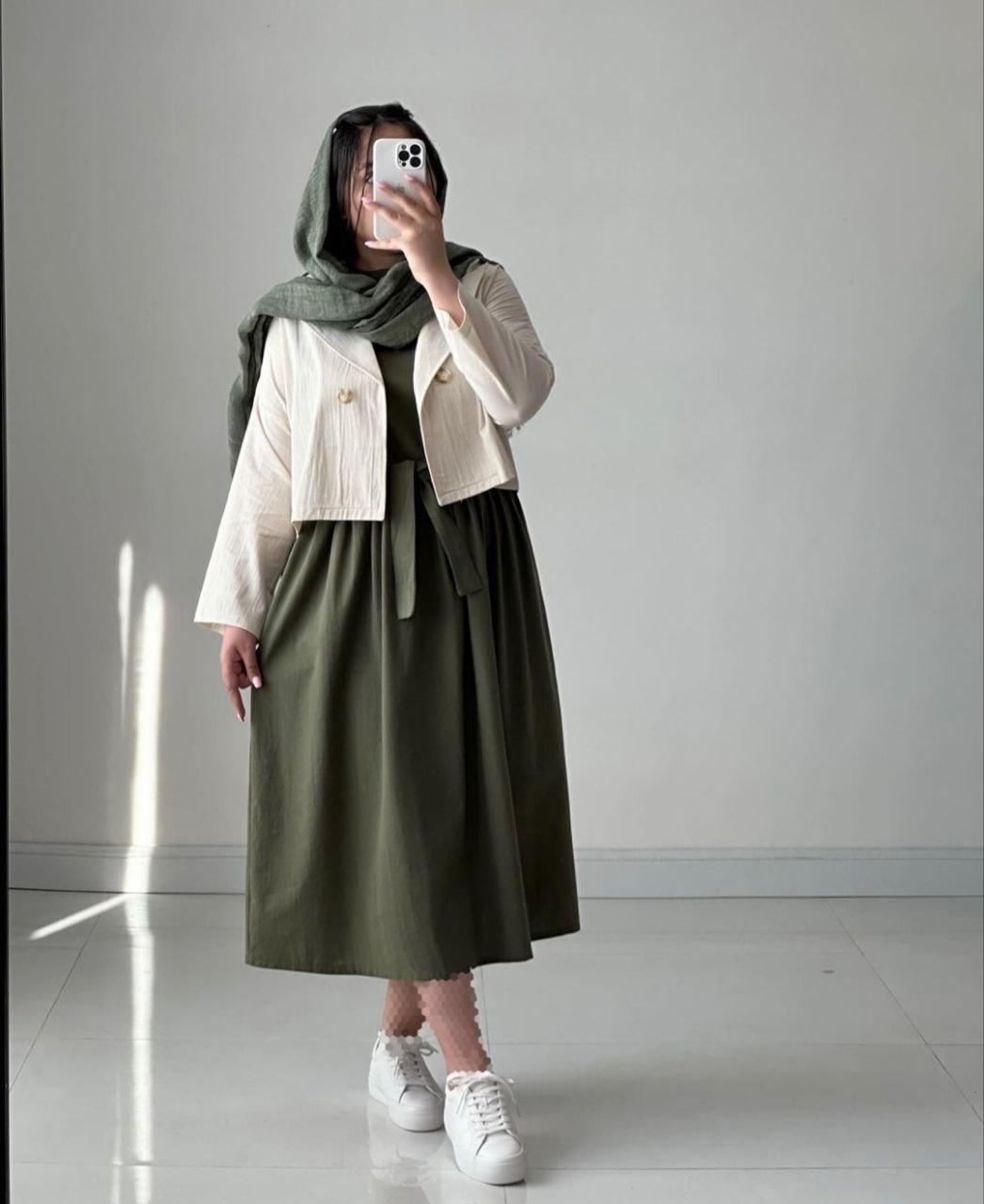 ✅️ پشت یقه زیره دکمه خورده جهت تنپوش راحت لباس و دارای کمربند میباشد جهت تنظیم سایز