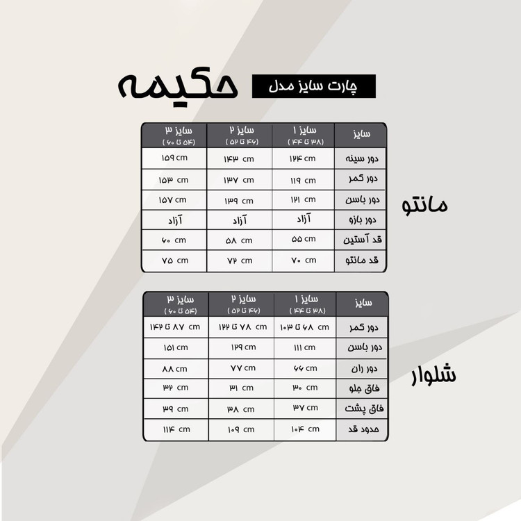 سایز ها : سایز دو 46 تا 52, سایز سه 54 تا 60, سایز یک 38 تا 44