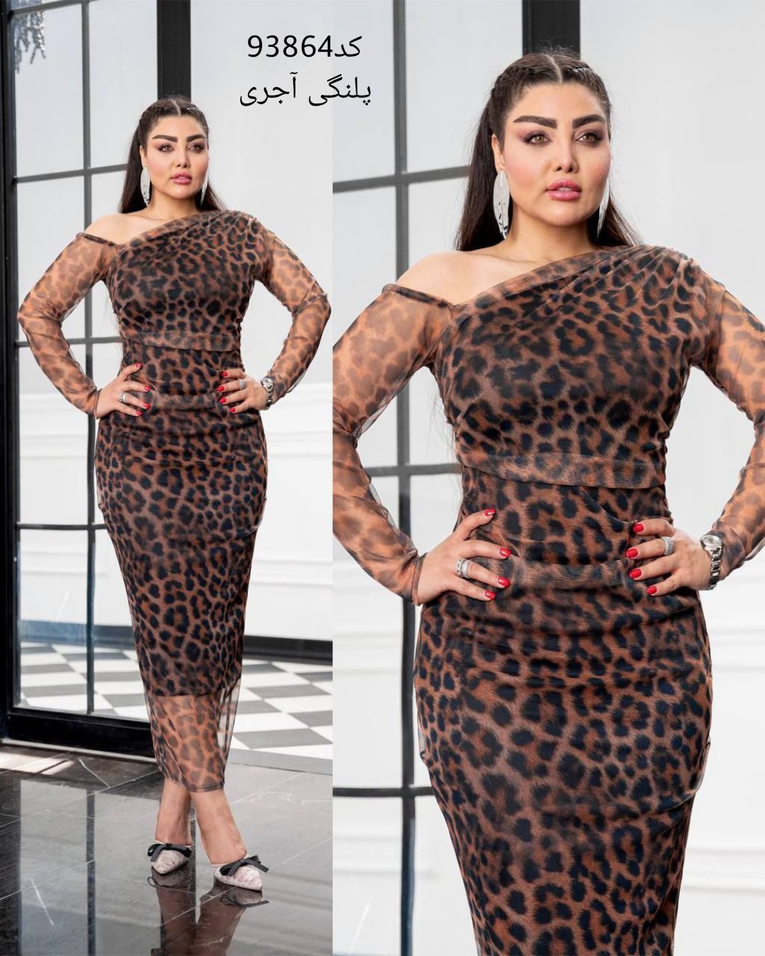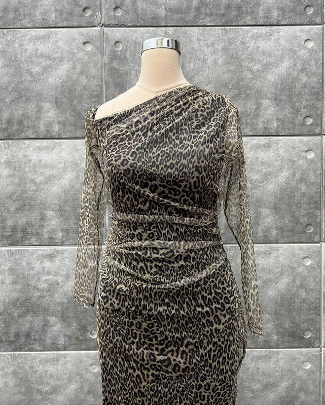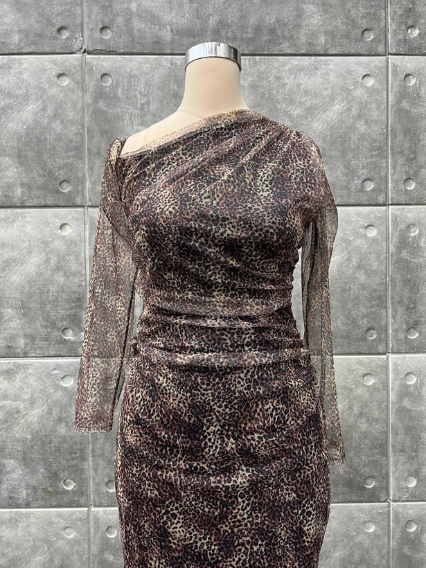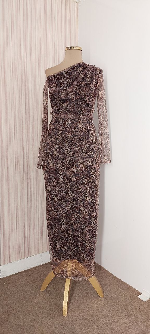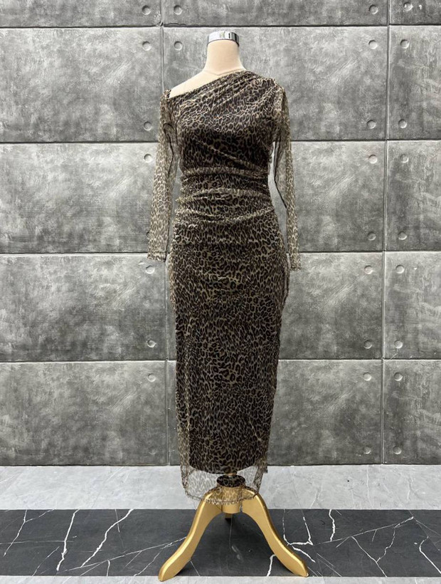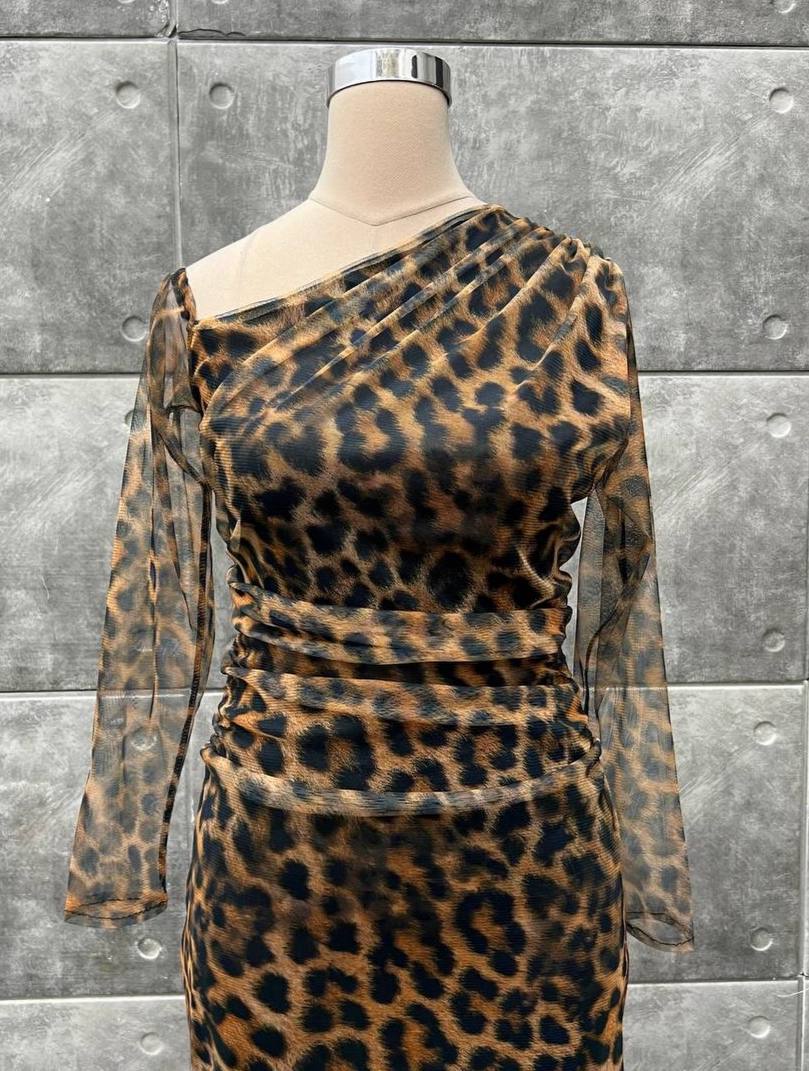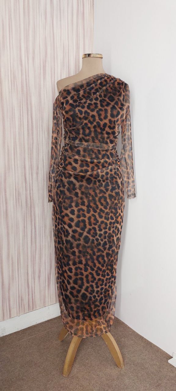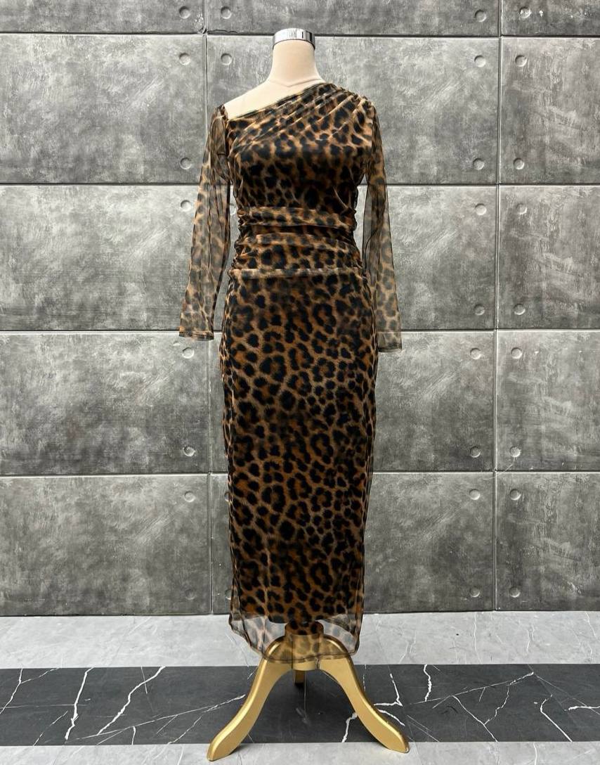 توضیحات: جنس : تور چاپ پلنگی(قد۱۲۵ )(پشت زیپ داره) رنگ بندی : پلنگی قهوهای سایز ها : (1)۳۸-۴۰, (2)۴۲-۴۴, (3)۴۶-۴۸, (4)۵۰